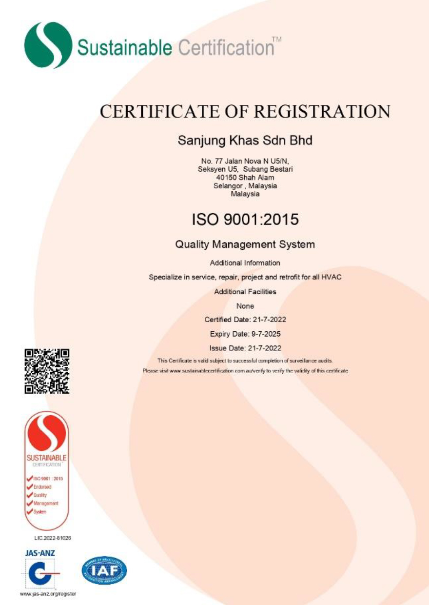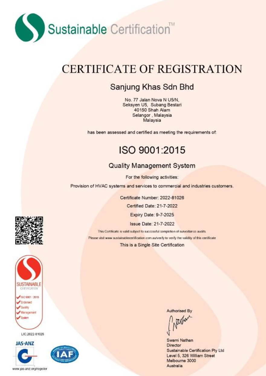 Established in 1997, from a minor company dealing in maintenance of the light commercial sector only, to a leading HVAC solutions provider in Malaysia today. We also successfully certified with ISO 9001:2015.
